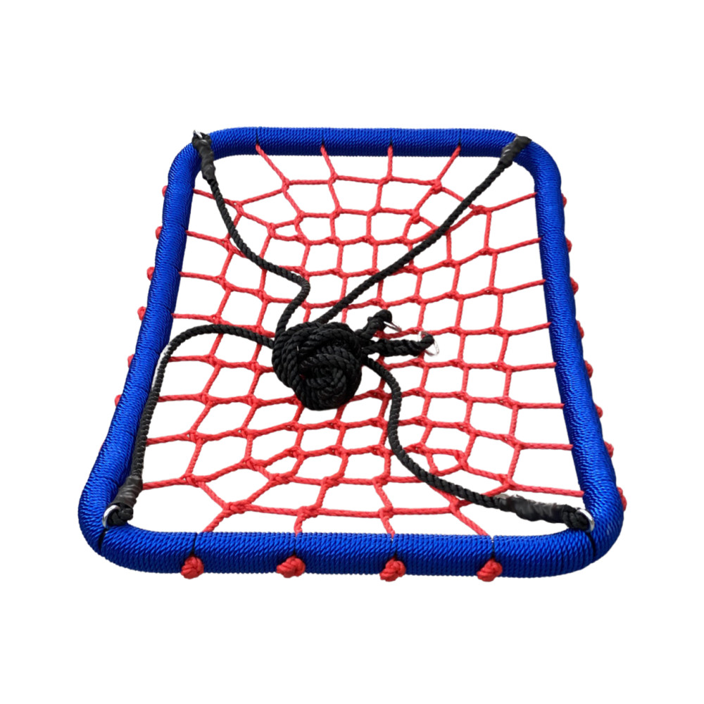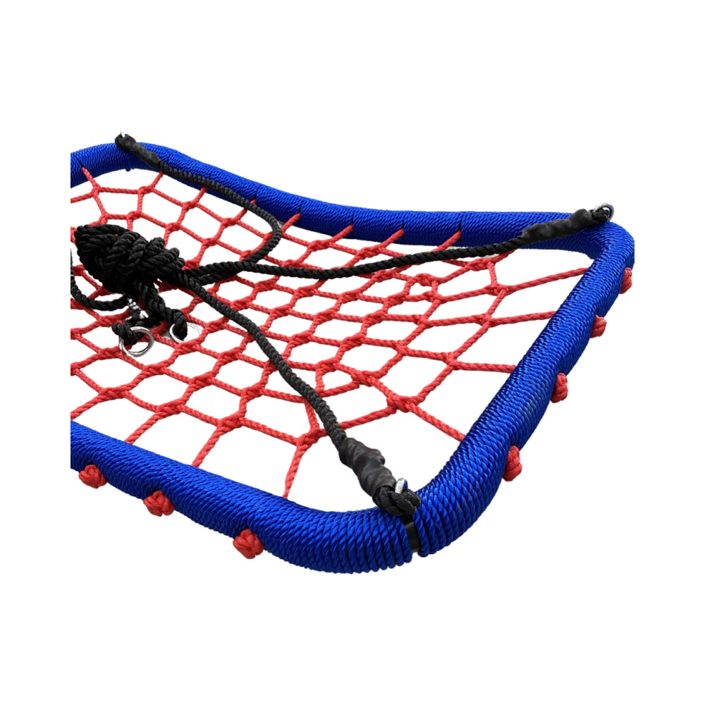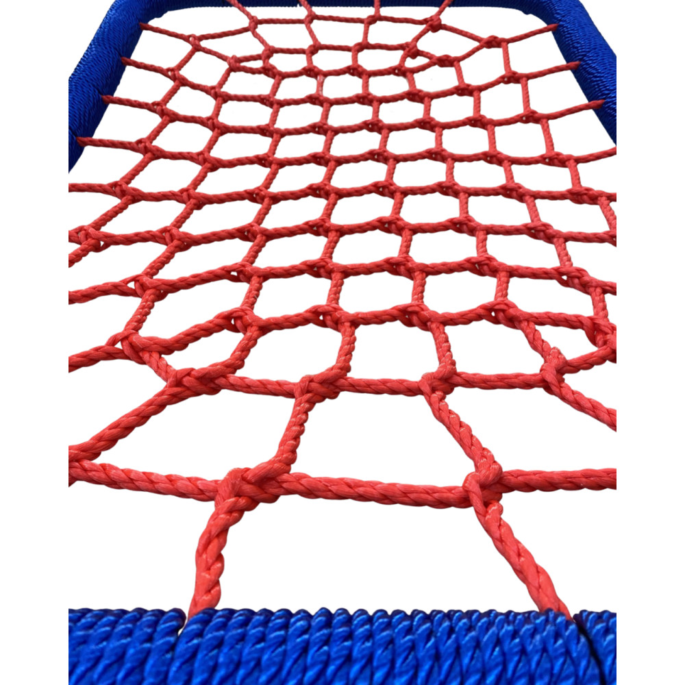 В основании качелей рама прямоугольной формы сделана из трубы диаметром 50 мм . Рама оплетена трехпрядным канатом 10 мм синего цвета. Внутри основания сплетена сеть из каната красного цвета толщиной 10 мм.