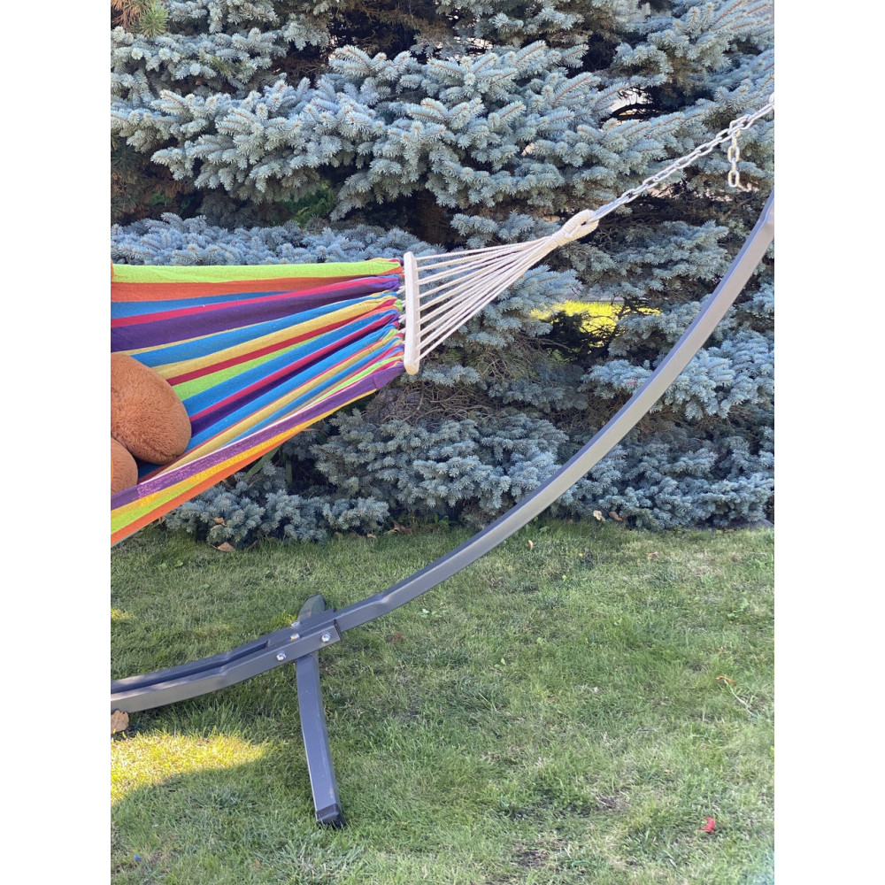 Каркас стойки подходит для всех типов гамаков: одноместного, двухместного, семейного. В комплекте со стойкой предоставляется весь необходимый комплект крепежей для сборки стойки и установки гамака.
