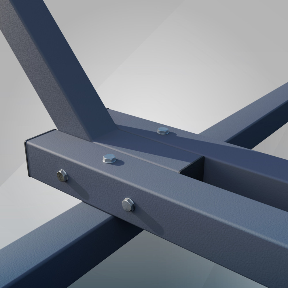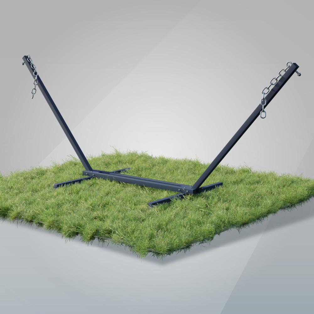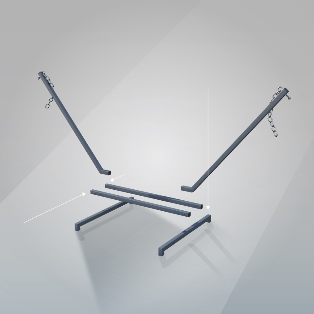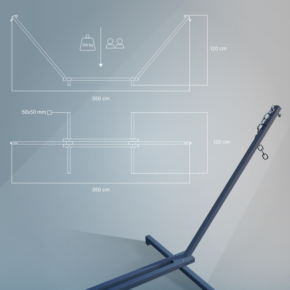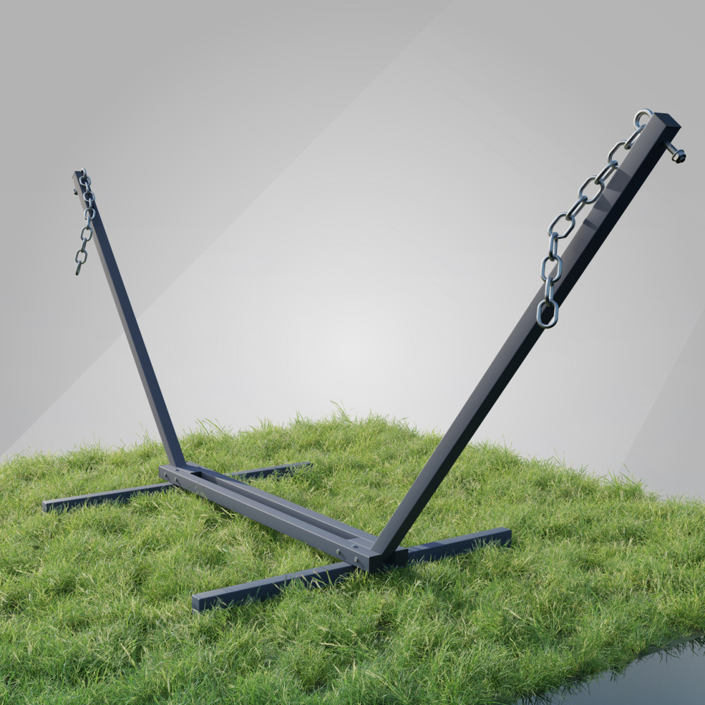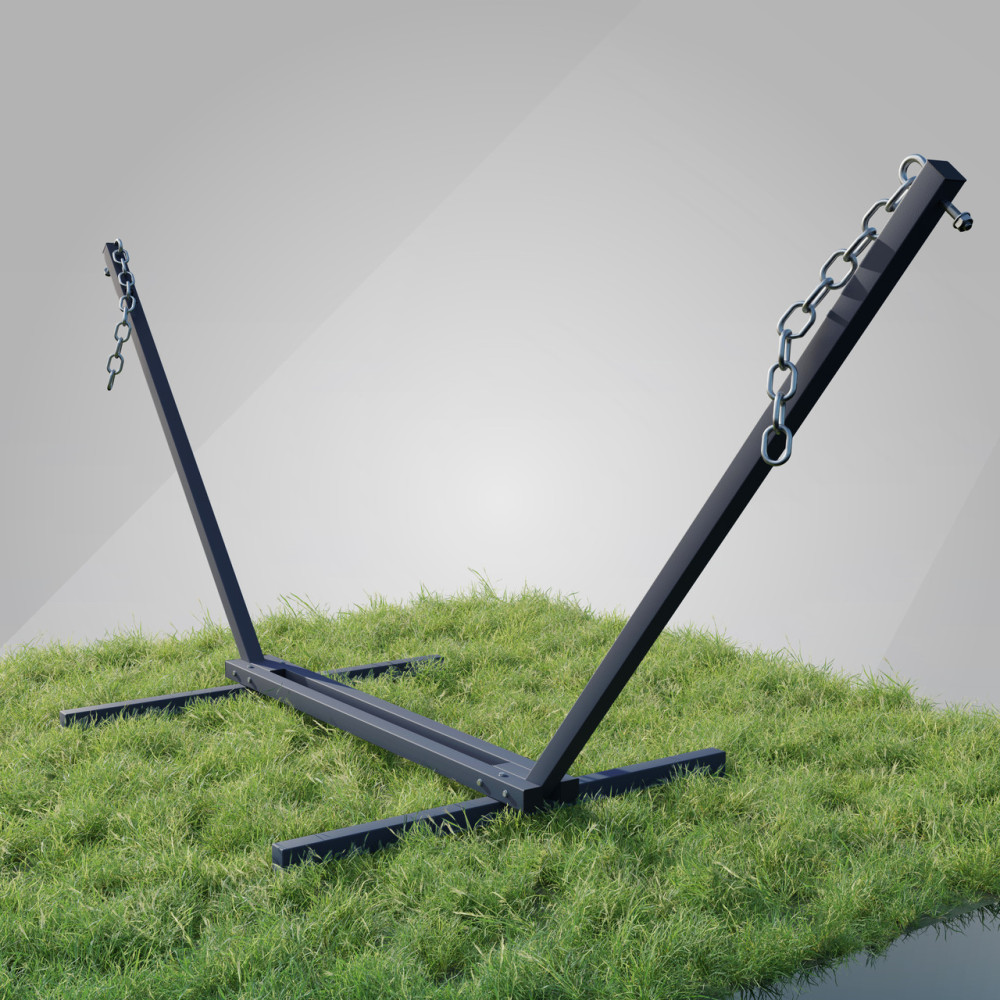 Стальной каркас для гамака изготовлен из металлического профиля 50х50, что делает его внешний вид массивным, а конструкцию прочной и устойчивой. Также стойка для гамака комплектуется всеми нужными элементами для крепления гамака (крюки М12, карабины М10 и цепи)