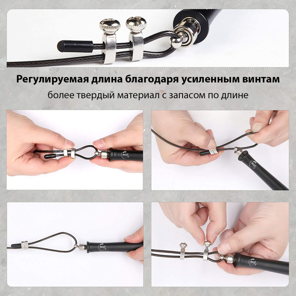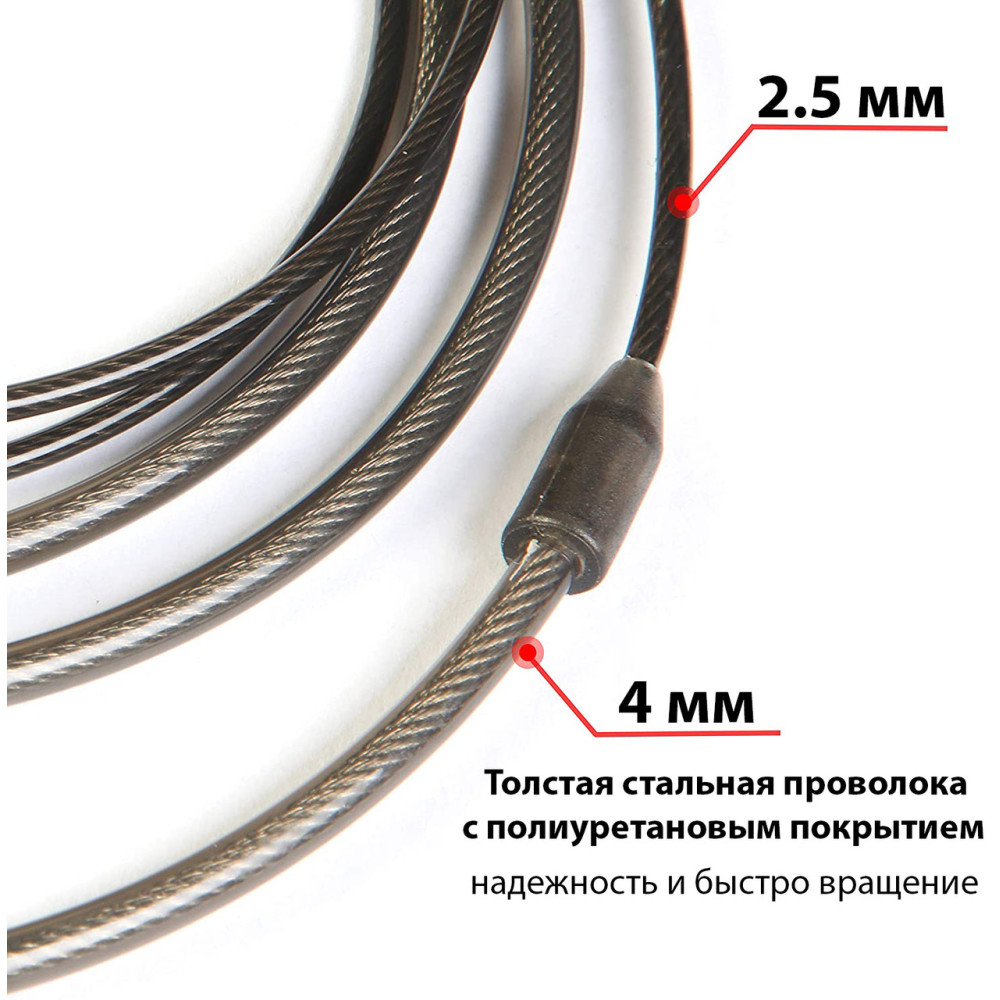 Шнур скакалки очень легкий и выполнен из тонкого стального троса, который закреплен на концах ручками. Шнур не запутывается, так как есть подшипники, и это особенно важно во время интенсивных тренировок.