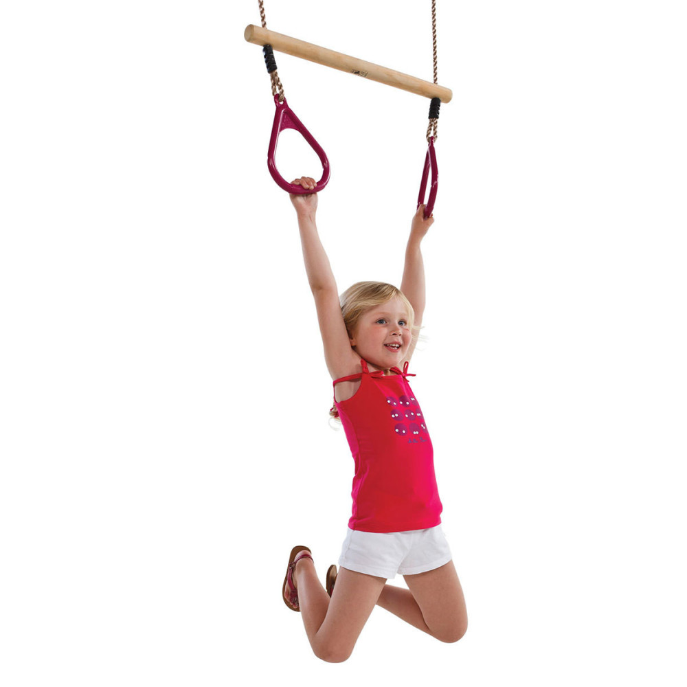 Трапеция с пластиковыми кольцами - это веселая комбинация двух игрушек. Она дает необходимую нагрузку на все группы мышц, а также замечательно развивает цепкость, ловкость и гибкость. Деревянная трапеция изготовлена из древесины твердых пород, безопасных для использования детьми. Пропитана антисептиком. Кольца изготовлены ударостойкого пластика.