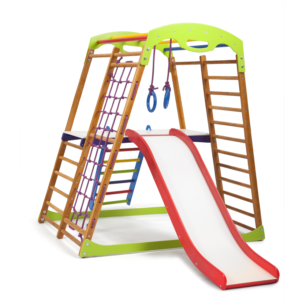 Всім відомо, що дитині потрібна фізична активність, оскільки діти власними силами дуже енергійні. Пасивні заняття набагато частіше викликають у них нудьгу, тому необхідно зробити все можливе, щоб малюк звикав до спорту якомога раніше. Для цього необхідно дитячий спортивний комплекс для будинку babywood plus 2 купити та встановити у кімнаті дитини. Таким чином, він завжди буде весело та активно проводити свій час у домашніх умовах. Спортивно-ігровий комплекс має всі необхідні елементи для повноцінного фізичного розвитку дитини. Тут є шведська стінка, сходи, гірка, гімнастичні обручки, рукохід, гладіаторська сітка. А для відпочинку і спокійніших ігор передбачений столик. Невеликі розміри дозволяють встановити спорткомплекс навіть у малогабаритному приміщенні. Снаряд відповідає всім вимогам безпеки: всі деталі надійно закріплені, а він виконаний тільки з натуральних матеріалів. До того ж, на дитячий спортивний комплекс для дому Бебі вуд plus 2 ціна вигідна та доступна. Такий цікавий та яскравий снаряд стане улюбленим місцем Вашої дитини. Часто буває, що дитина перегорає і швидко втрачає інтерес до будь-чого, тому дуже важливо з боку дорослих прищеплювати своєму чаду любов до спорту з ранніх років, показувати користь на власному прикладі, допомагати йому освоювати тренажер спочатку. Тоді, через певний час, дитина вже сама потребуватиме елементарних фізичних навантажень. Це також чудова альтернатива вуличним ігровим майданчикам у погану погоду.