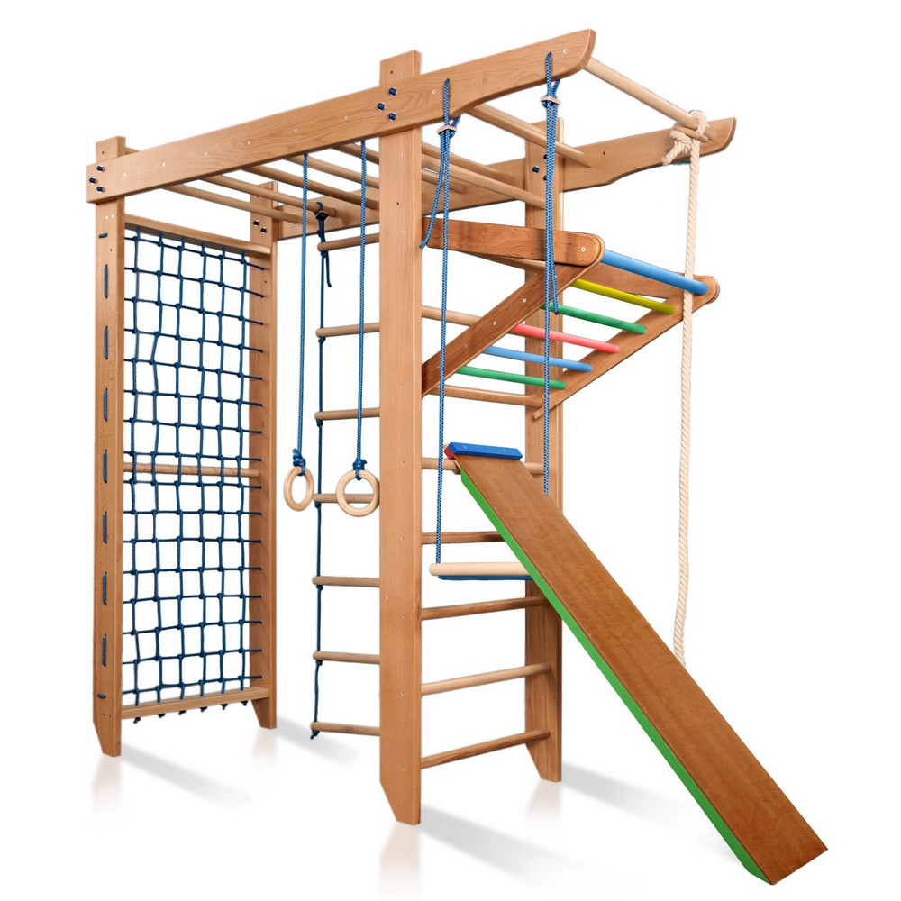 Дитячий спортивний куточок з рукоходом "Гімнаст-220" - домашній спорткомплекс, виконаний відомим виробником спортивних стінок "SportBaby". Габарити даної моделі складають 220-80 см, важить при цьому куточок лише 45 кг. Виконаний куточок із міцного та довговічного бука. Використовуючи цей спорткомплекс, дитина зможе лазити по шведській стінці, «проходити» рукохід, качати прес, використовуючи перекладини турніку та міцну дошку. Поперечини рукохода і шведської стінки дуже надійні, вони дозволяють моделі витримувати до 120 кг ваги, як і сітка. Елементи мотузкового набору куточка також дадуть можливість займатися навіть досить великим та дорослим діткам.