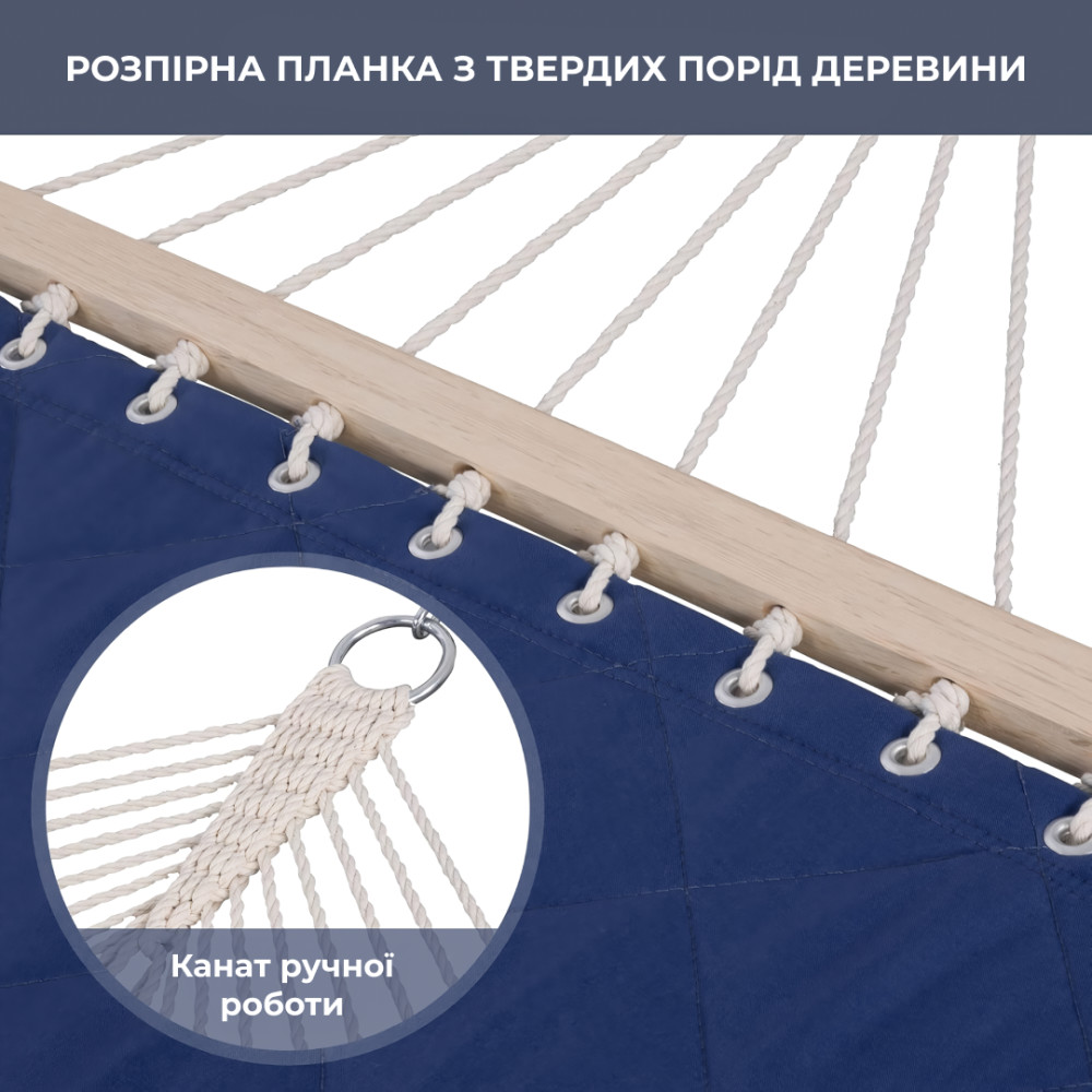 Большой гамак с легкостью выдерживает двух взрослых людей. Мягкий наполнитель гамака делает его комфортным, а износостойкая двухслойная оболочка долго сохраняет первоначальный вид гамака. Прочность и долговечность используемых материалов, позволит вам оставлять гамак на открытом воздухе не опасаясь непогоды все лето напролет! Специальный дизайн шитья увеличивает красоту и практичность стеганого гамака. Дополнительная полиэтиленовая набивка гамака обеспечивает вам превосходный комфорт. Она не выцветет после длительного использования. Крепёжная веревка изготовлена из полиэфирных и хлопковых нитей, что более долговечно и безопасно. Ручная работа плетеных веревок не только повышает устойчивость, но и улучшает эстетику.