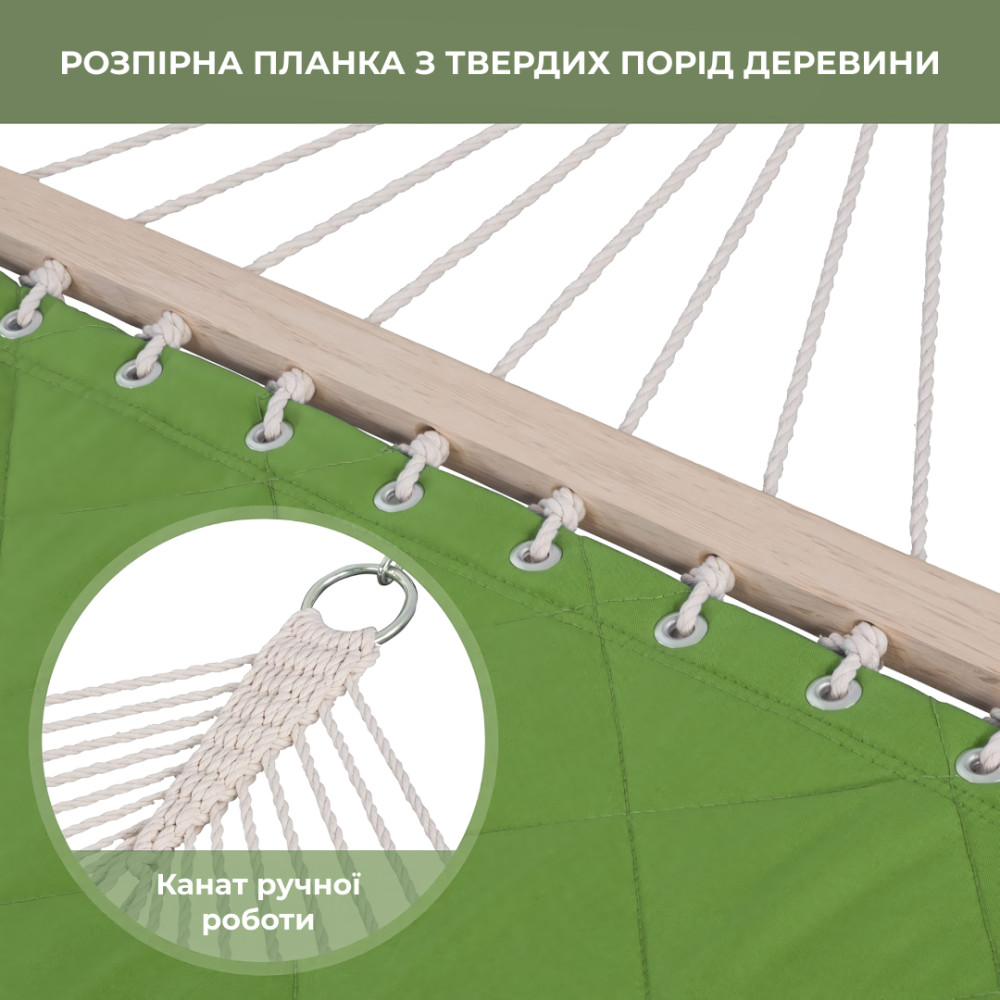 Большой гамак с легкостью выдерживает двух взрослых людей. Мягкий наполнитель гамака делает его комфортным, а износостойкая двухслойная оболочка долго сохраняет первоначальный вид гамака. Прочность и долговечность используемых материалов, позволит вам оставлять гамак на открытом воздухе не опасаясь непогоды все лето напролет! Специальный дизайн шитья увеличивает красоту и практичность стеганого гамака. Дополнительная полиэтиленовая набивка гамака обеспечивает вам превосходный комфорт. Она не выцветет после длительного использования. Крепёжная веревка изготовлена из полиэфирных и хлопковых нитей, что более долговечно и безопасно. Ручная работа плетеных веревок не только повышает устойчивость, но и улучшает эстетику.