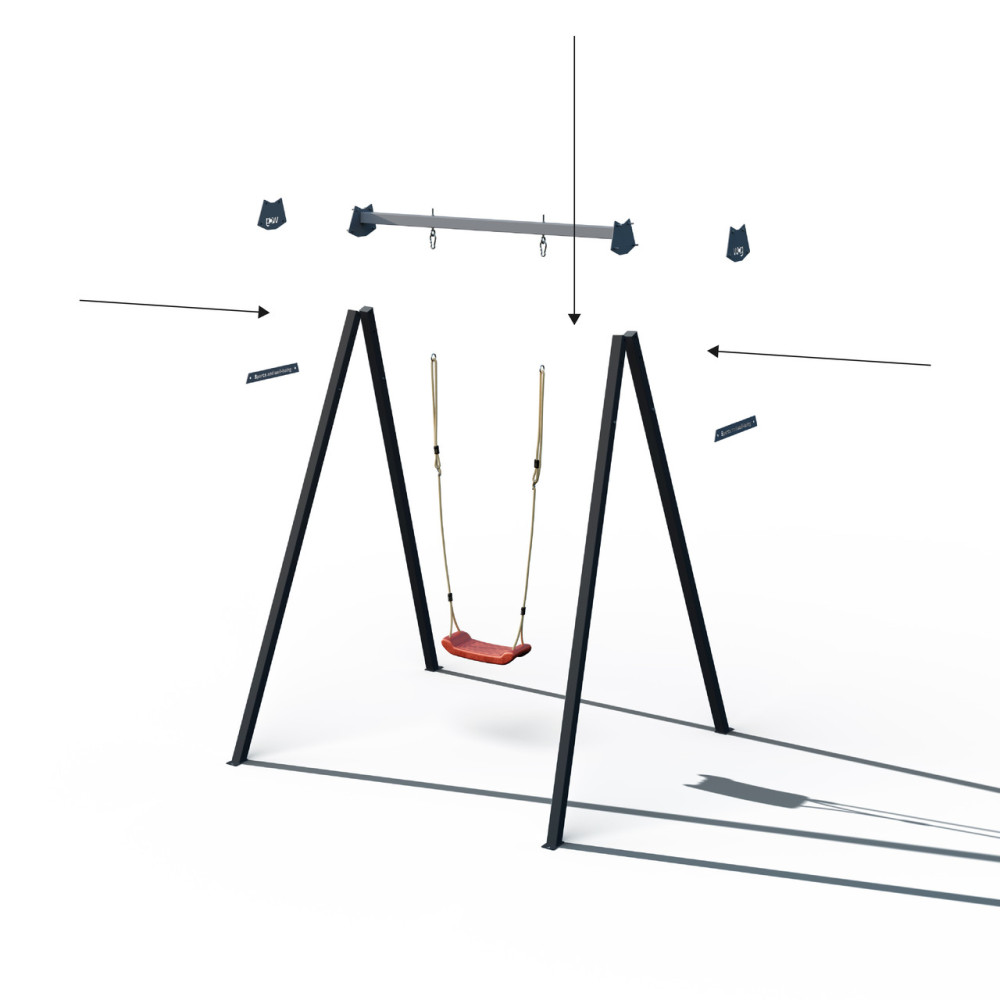 - Возможность выбора одного из пяти цветов верхней перекладины и боковых пластин: красный, салатовый, графитовый, синий или жёлтый — чтобы идеально сочетать его с вашими качелями. При этом ножки каркаса остаются в стильном матовом чёрном цвете.