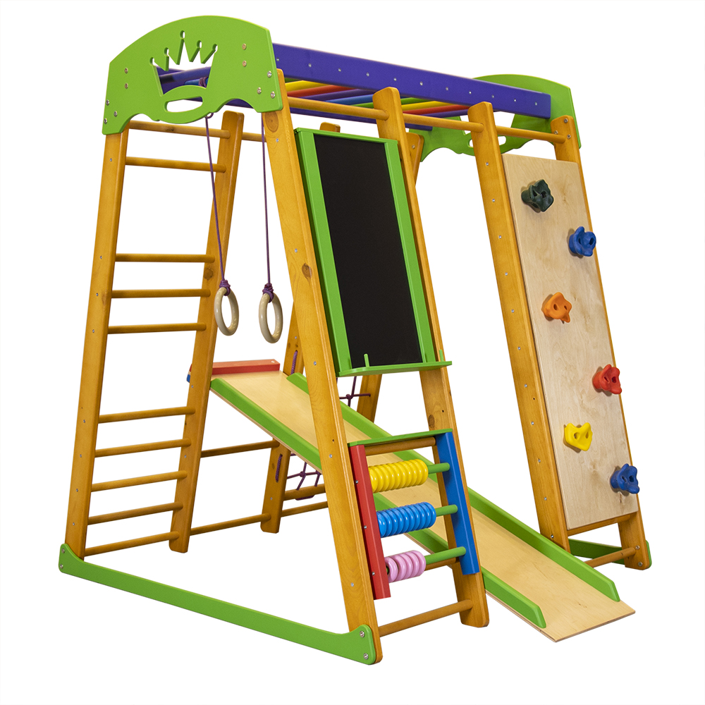 Завдяки класичному кольору, комплекс добре впишеться в найсуворіший інтер'єр, якщо немає можливості розмістити його в дитячій кімнаті. Гірка виготовлена з бука і покрита спеціальним складом, що виключає шорсткість.