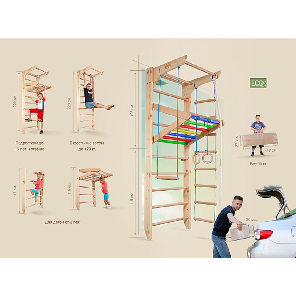Цей спортивний куточок виготовлений з натурального дерева – твердих порід сосни та бука, вирощених у екологічно чистих областях України.