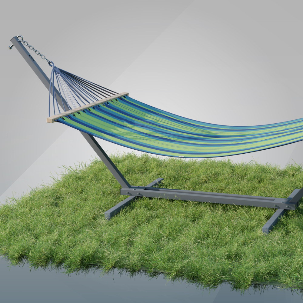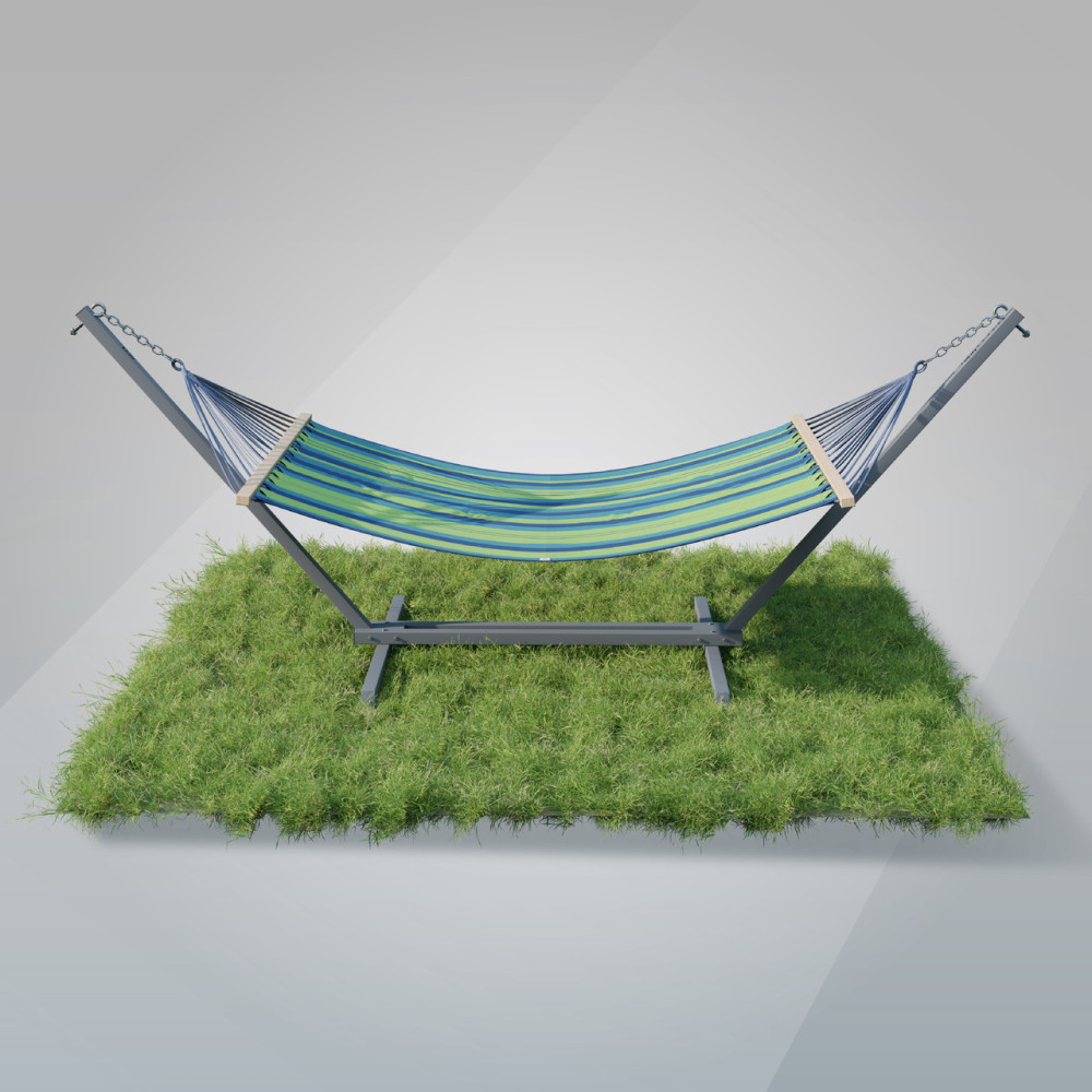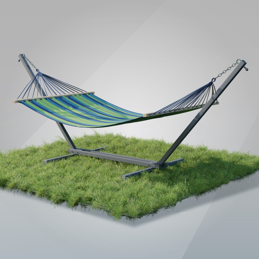 Стальной каркас для гамака изготовлен из металлического профиля 50х50, что делает его внешний вид массивным, а конструкцию прочной и устойчивой. Также стойка для гамака комплектуется всеми нужными элементами для крепления гамака (крюки М12, карабины М10 и цепи)
