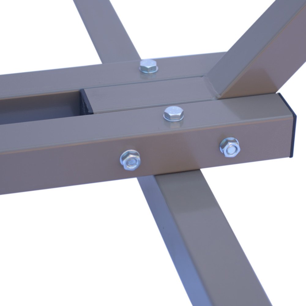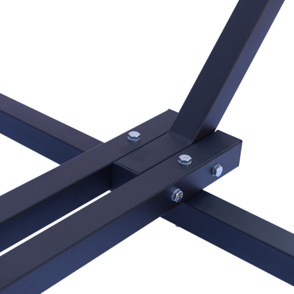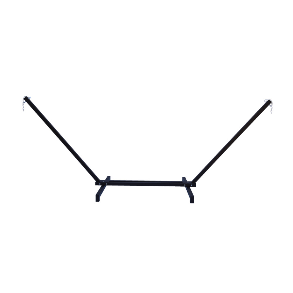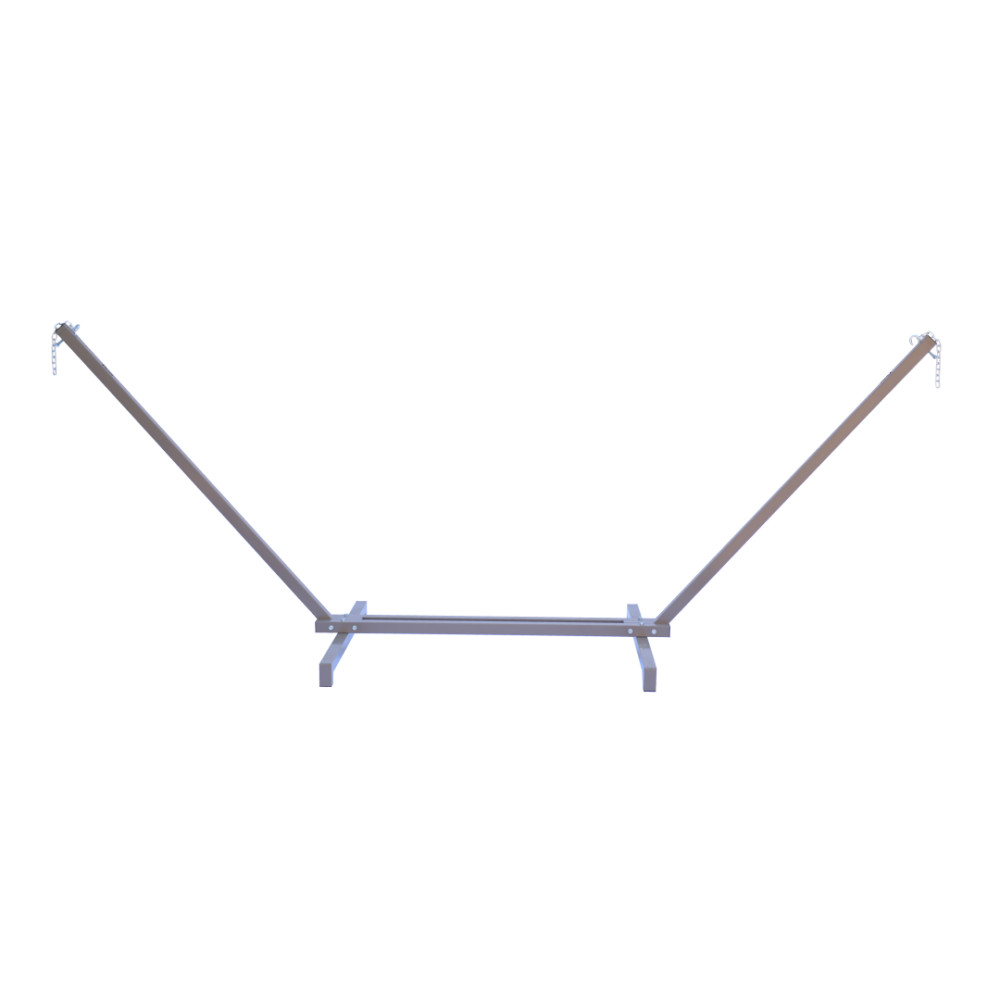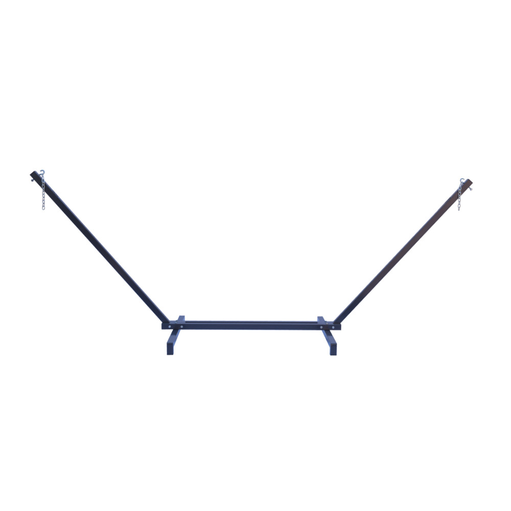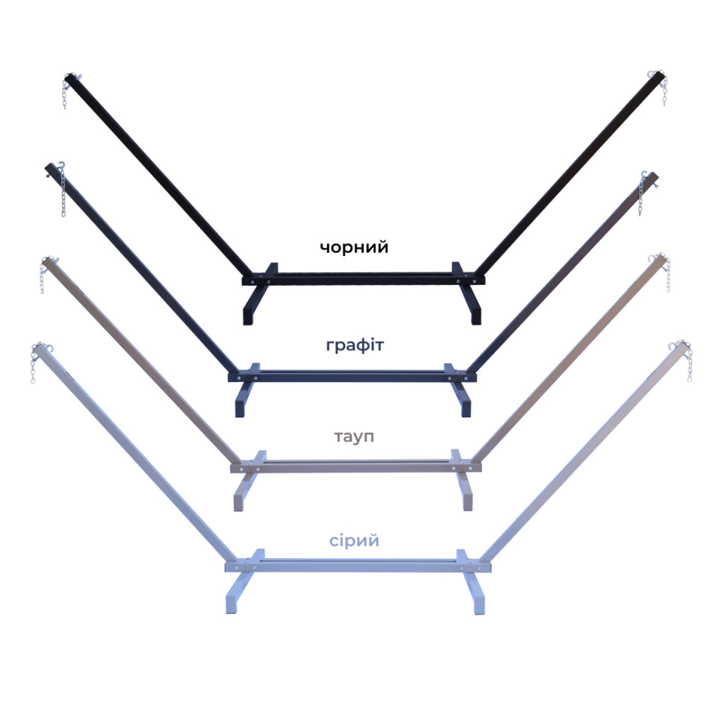 Стальной каркас для гамака изготовлен из металлического профиля 50х50, что делает его внешний вид массивным, а конструкцию прочной и устойчивой. Также стойка для гамака комплектуется всеми нужными элементами для крепления гамака (крюки М12, карабины М10 и цепи)